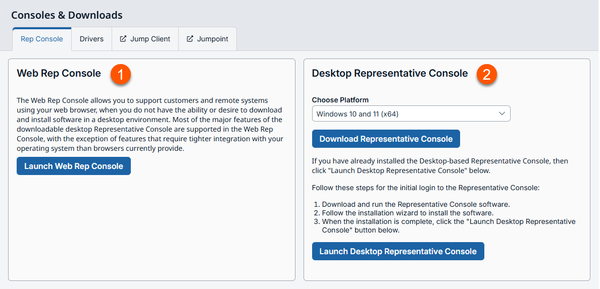 - Desktop Representative Console: Starts the download process of the full installer file.