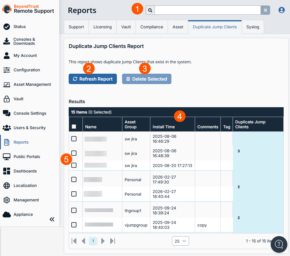 - The ability to select items in the Duplicate Jump Clients table and the Delete Selected button require administrator permission. If you do not have this permission, the ability to select rows in the table and the Delete Selected button is not available on the report page.