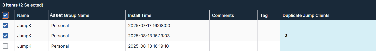 Item selection: Item selection for Jump Clients to remove which can be individual or use the select all checkbox in the header row of the table.