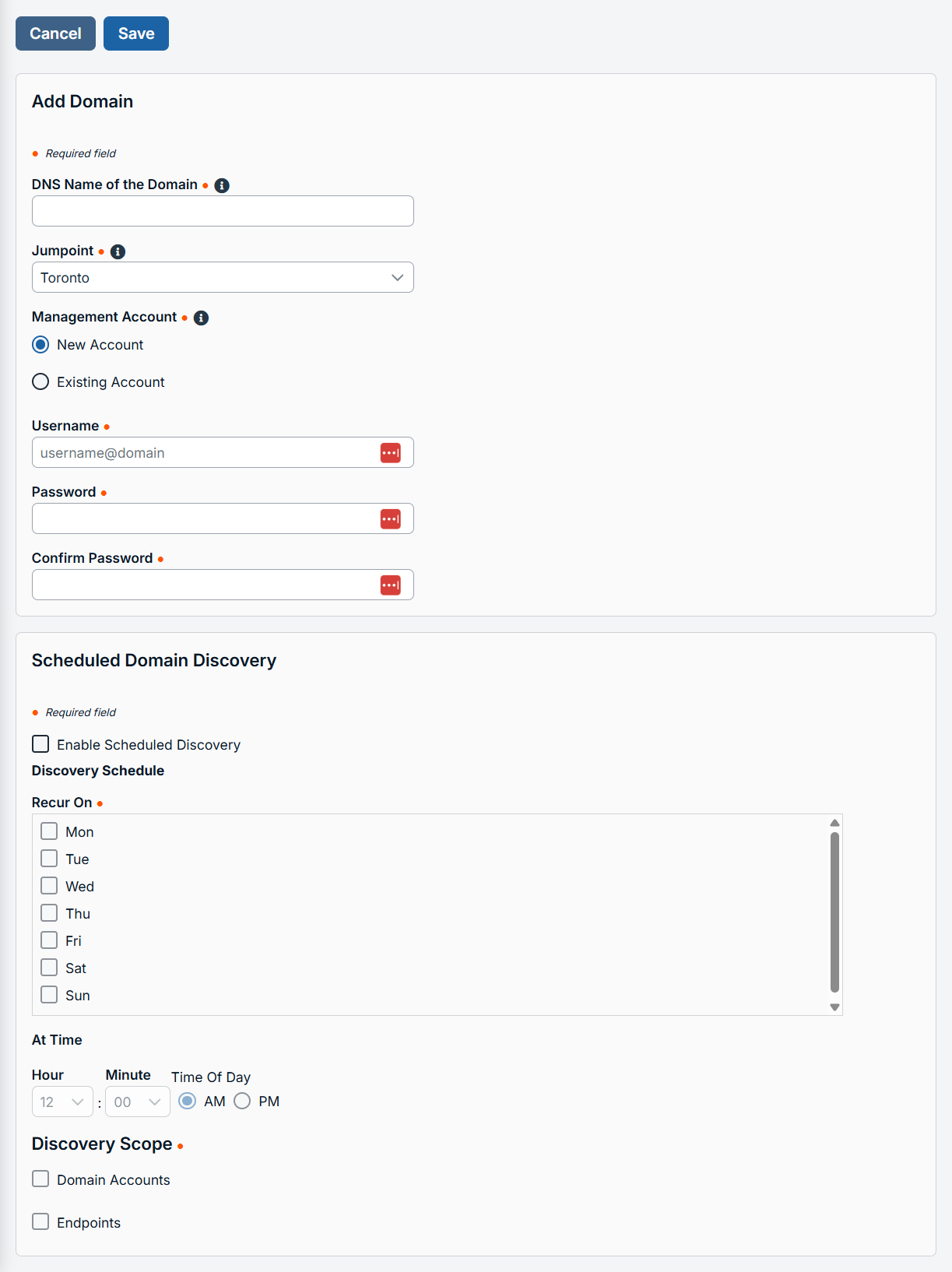 - For Management Account, this account is used to connect and perform the discovery of accounts and endpoints of the specified domain. You can choose to use a new account, which requires a Username, Password, and Password Confirmation or choose to use an existing account discovered from a previous job or added manually in the Accounts section where is the name of your domain you want to discover.