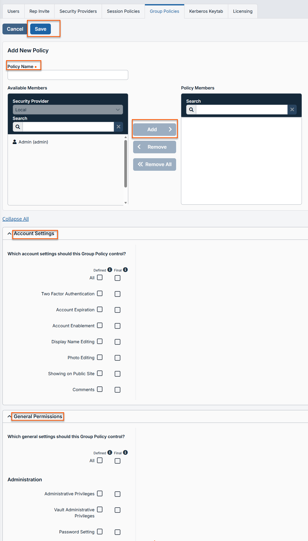 You can use the Search box to find existing members. You can select users from your local system or select users or entire groups from configured security providers. If an attempt to add a user from a configured security provider is invalid, the synchronization log error message appears here as well as in the log. - Select the various group policy settings. See Group Policy settings.