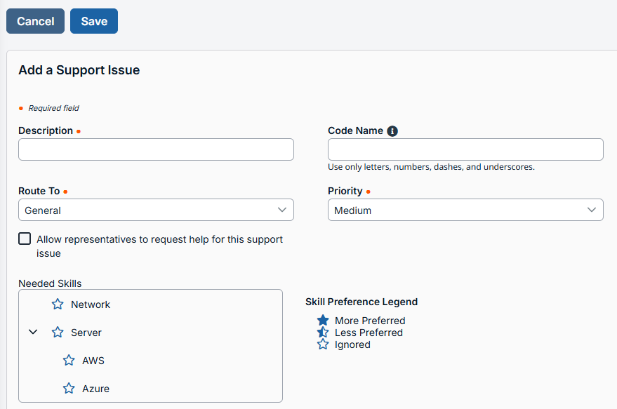 - Needed skills: Issues can be associated with the skills needed to resolve them best. Skills can be More Preferred, Less Preferred, or Ignored, depending on the level of knowledge required to resolve a given issue. This will determine how support requests are routed and handled by the system.