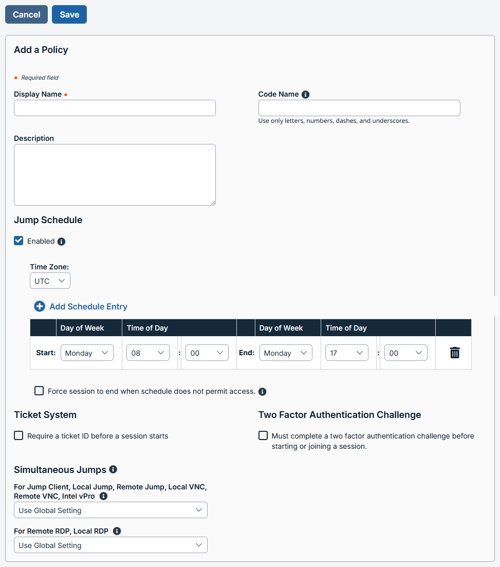 - Enter a Display name. This name should help users identify this policy when assigning it to Jump Clients.