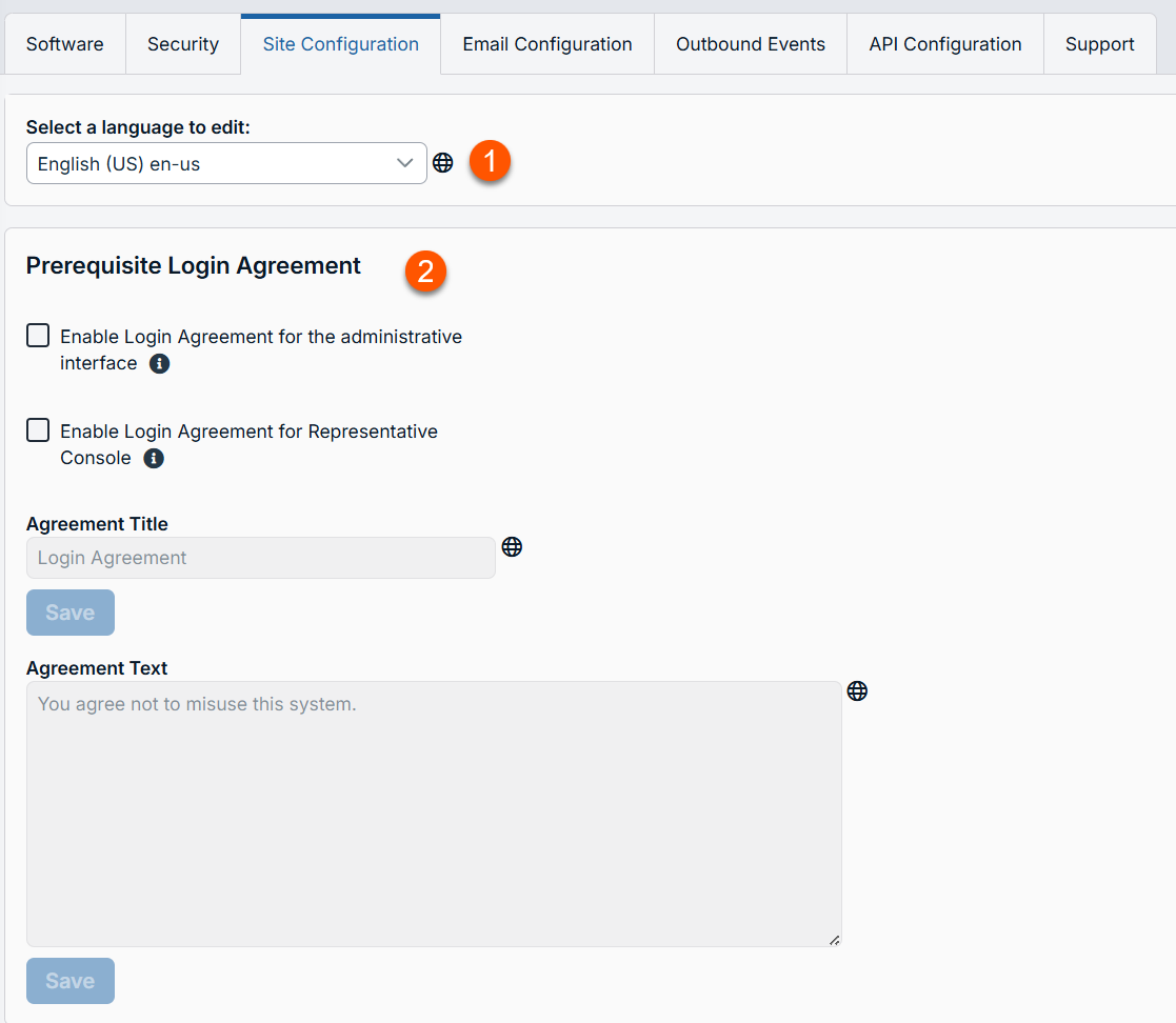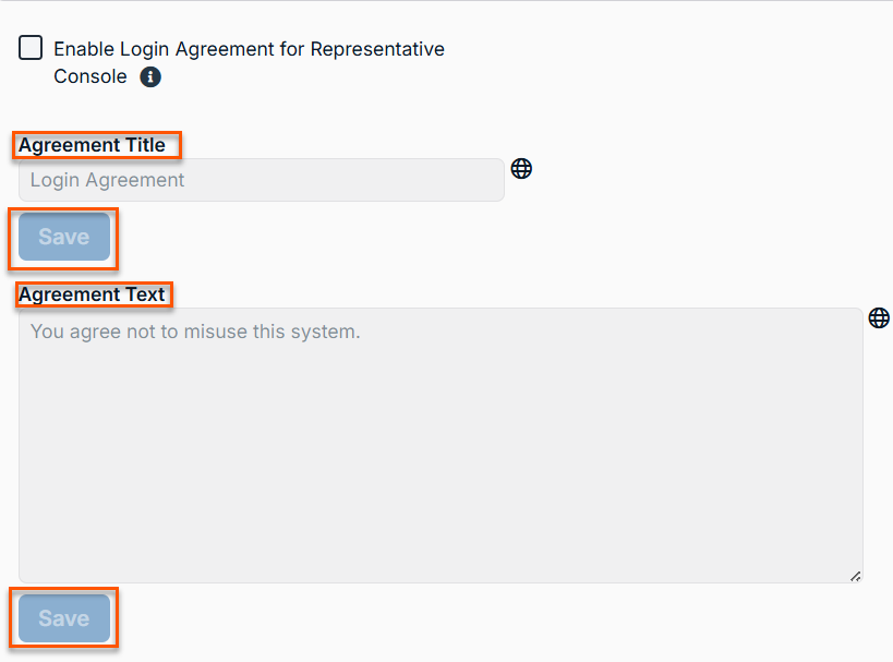 You can enable a login agreement that users must accept before accessing the /login administrative interface or the representative console. The configurable agreement allows you to specify restrictions and internal policy rules before users are allowed to log in.