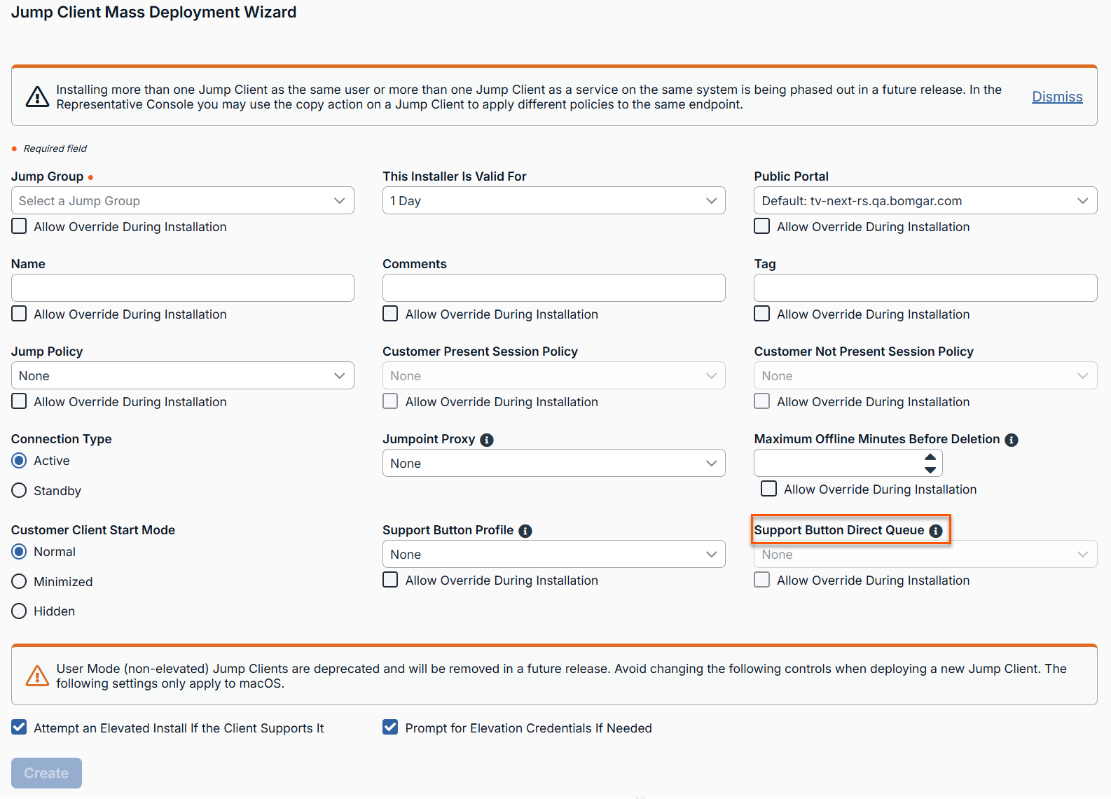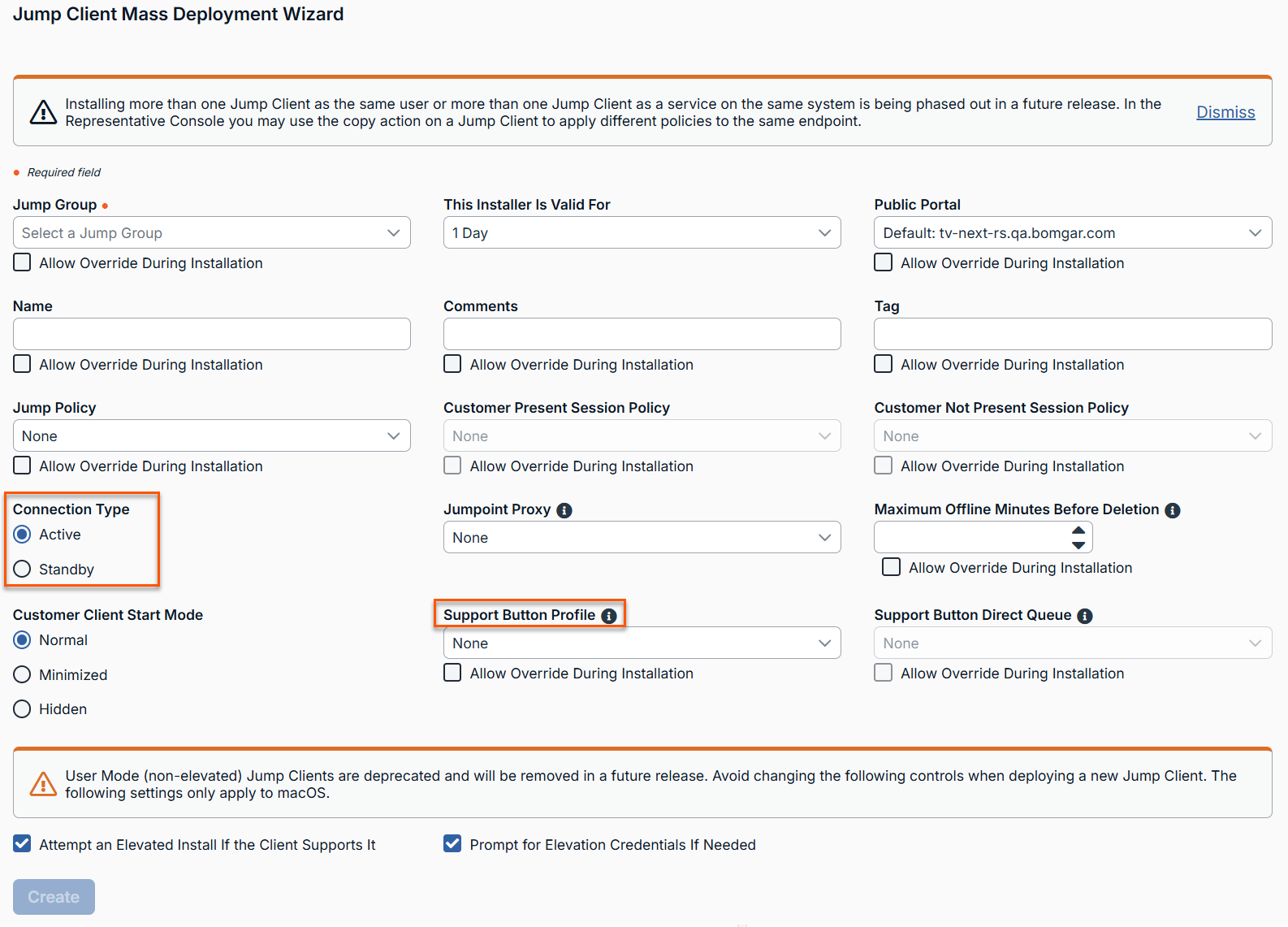 To deploy a Jump Client that allows a local user to initiate a session using a Support Button, configure these two settings in the Jump Client Mass Deploy Wizard: