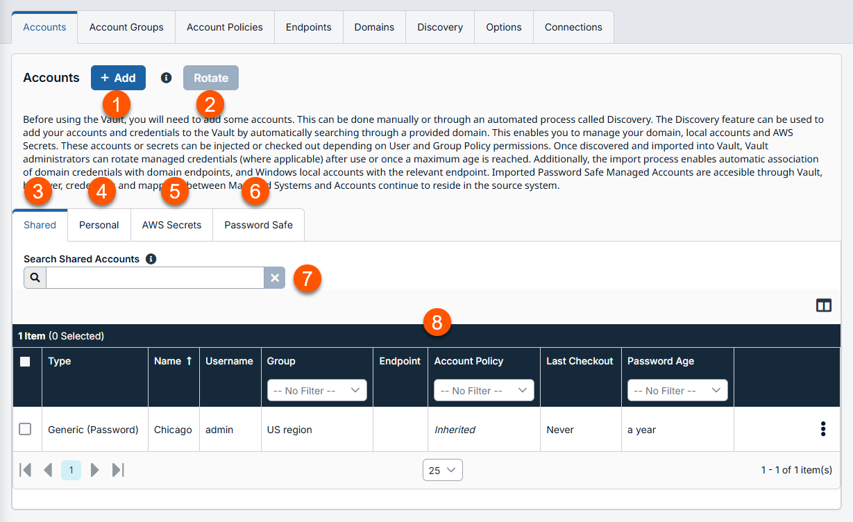 Rotate: Rotates privileged credentials. You must select an existing account in the list for Rotate to become available.