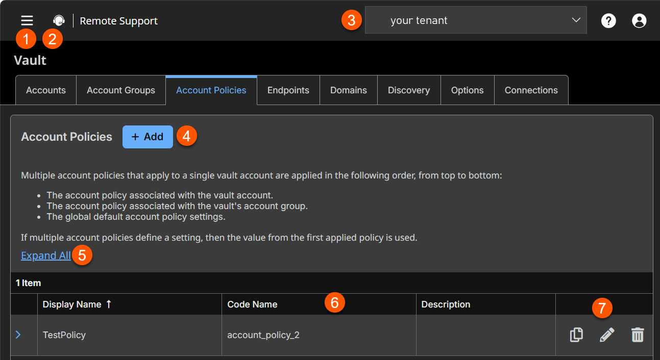 The Vault page opens and the Accounts tab displays by default. - At the top of the page, click Account Policies.
