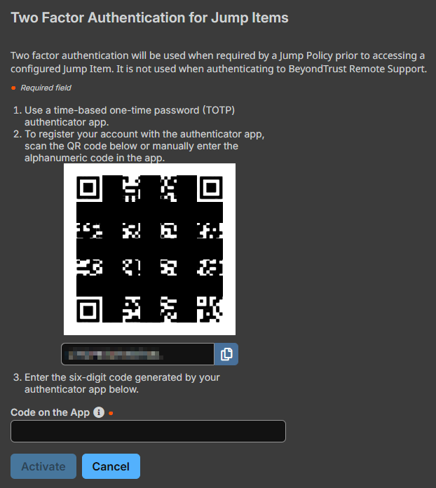 The two factor authentication activates, and you are required to use it the next time you Jump to a Jump Item requiring two-factor authentication.
