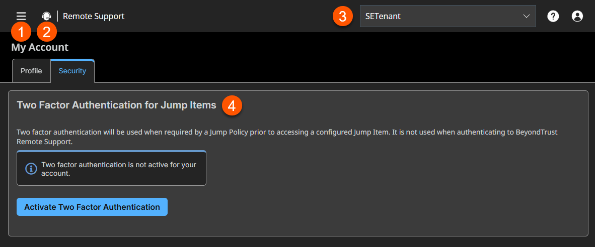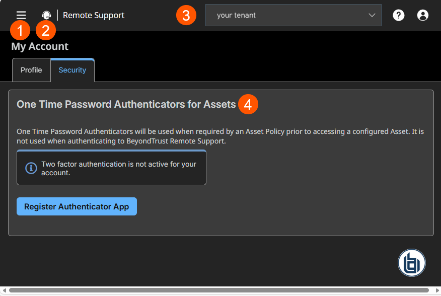 The BeyondTrust Home page displays. - From the main menu, click Remote Support > My Account.