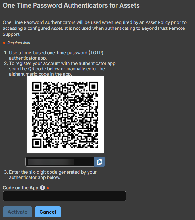 In Remote Support, scan the QR code, or, in your authenticator app, manually enter the generated code below the QR code.