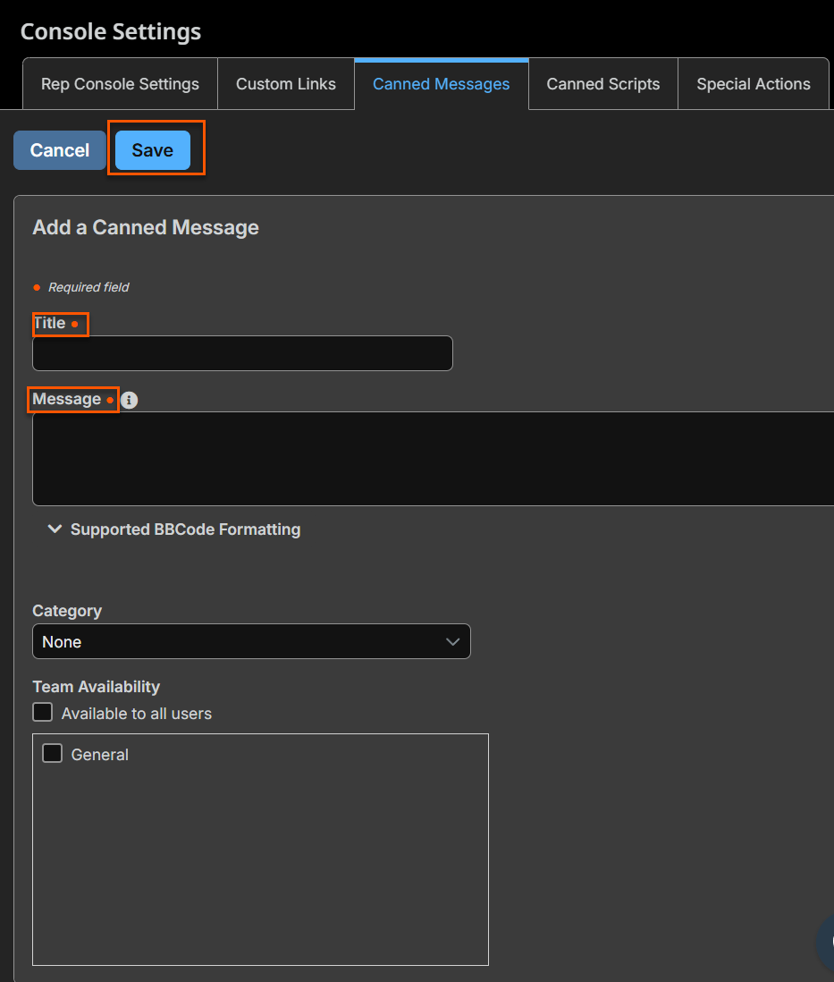 - Enter the Message to create the text that will display in the customer chat. You can use BBCode to do some low level formatting, such as adding bold, colors, or hyperlinks. Click on Supported BBCode Formatting to display a list of codes and their resulting applications.