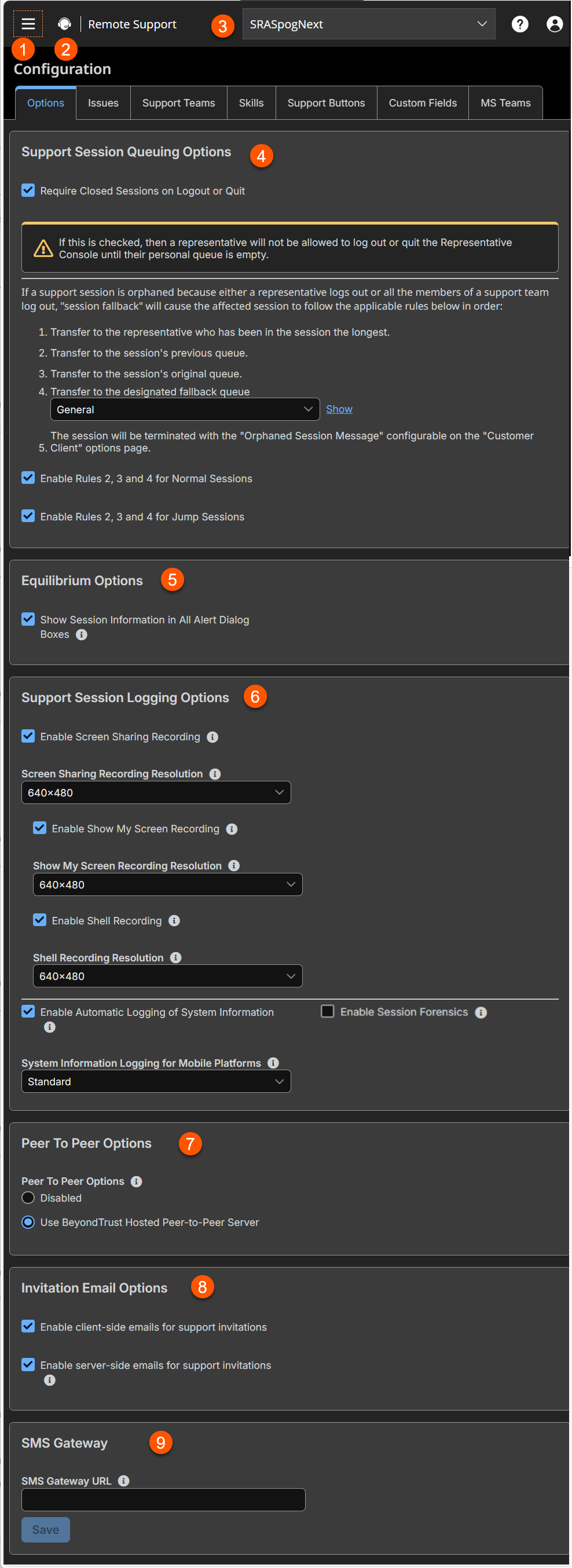 - Support Sessions Logging Options: Determines how representatives can share and record during sessions.