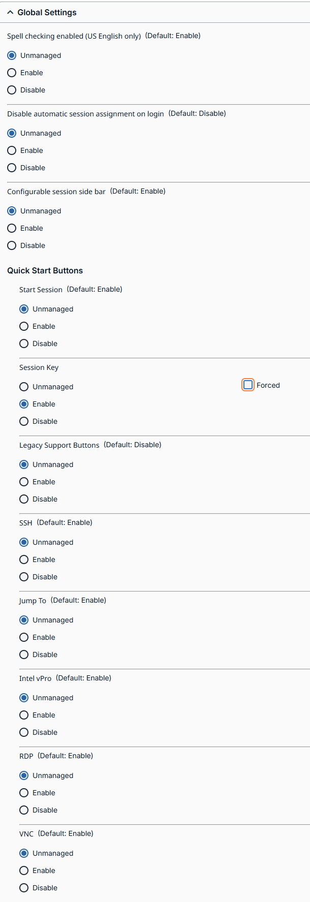 You can configure the default representative console settings for your entire user base, applying a consistent representative console user experience and increasing team efficiency. You can force settings, allow settings to be overridden by the user, or leave settings unmanaged. If you select Unmanaged, the BeyondTrust default setting will be displayed alongside for your consideration.