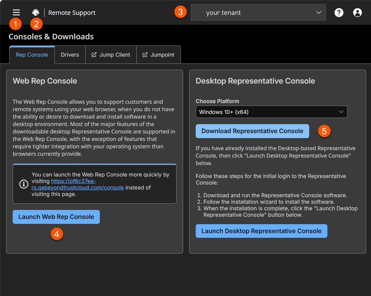 The representative console is the interface used by your representatives to access all of Remote Support's features and functionality. You can access the rep console via a desktop client (the desktop rep console or via the web (the web rep console). Remote Support also offers an Android rep console app and an iOS rep console app.