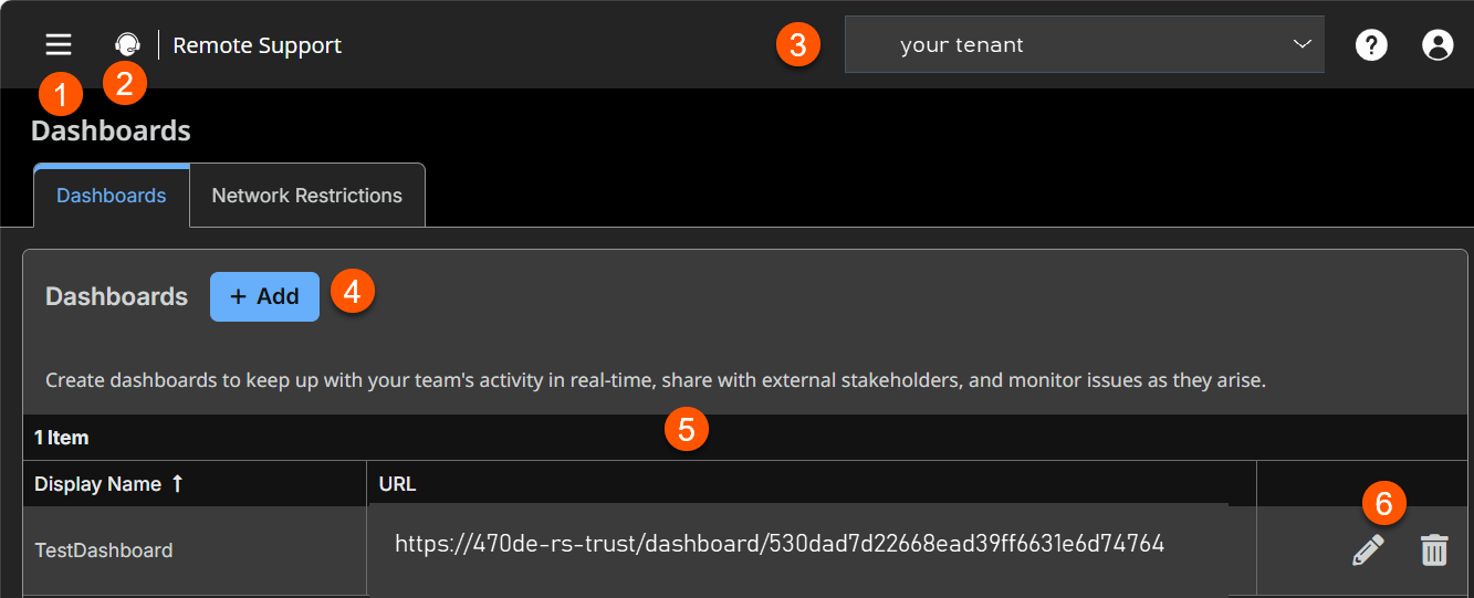 The Dashboards page displays. - From the Dashboard table, select a dashboard.