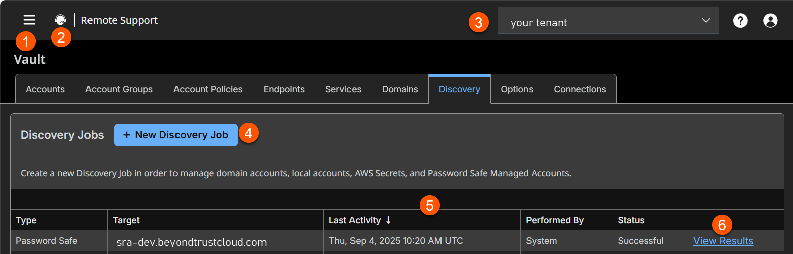 The Vault page opens and the Accounts tab displays by default. - At the top of the page, click Discovery.