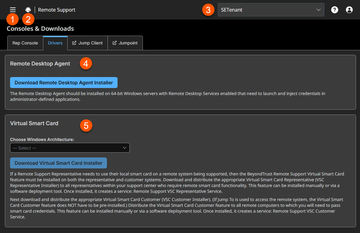 The Drivers tab gives you access to downloaders for the Remote Desktop Agent and virtual smart cards.