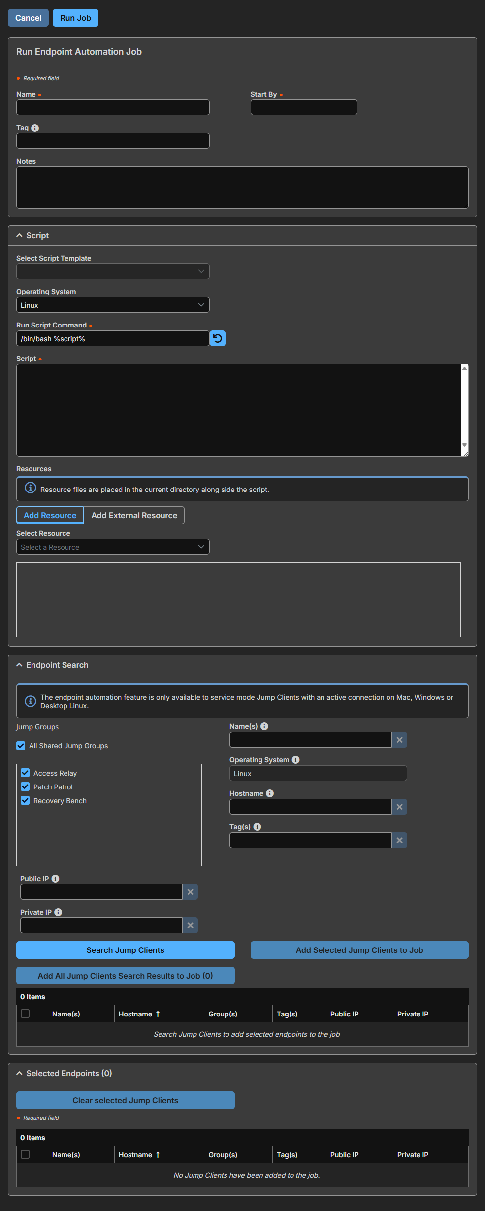 - Now enter the search criteria for your endpoints. For more information about each option, click the i icon beside it. You must click Search Jump Clients before any endpoints become available. Remember that you will see only endpoints with the same operating system as designated by the script above.