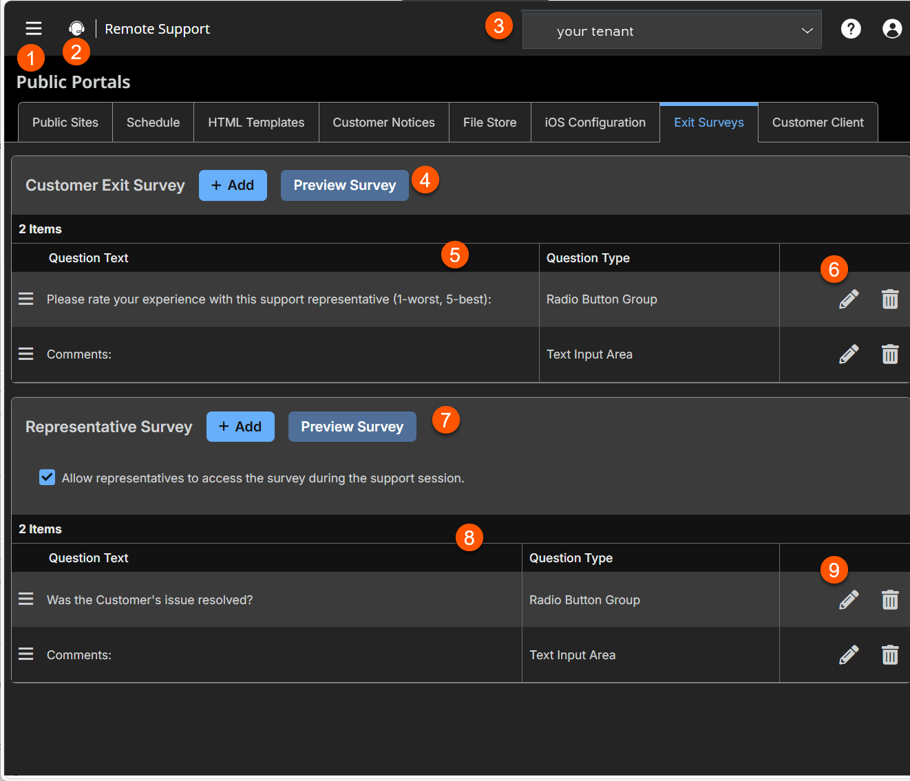 Exit surveys are customizable questionnaires designed to gather feedback from customers and representatives regarding satisfaction levels and incident resolution rates after support sessions. Questions are assigned to a support site’s surveys from the Public Portals > Public Sites page.