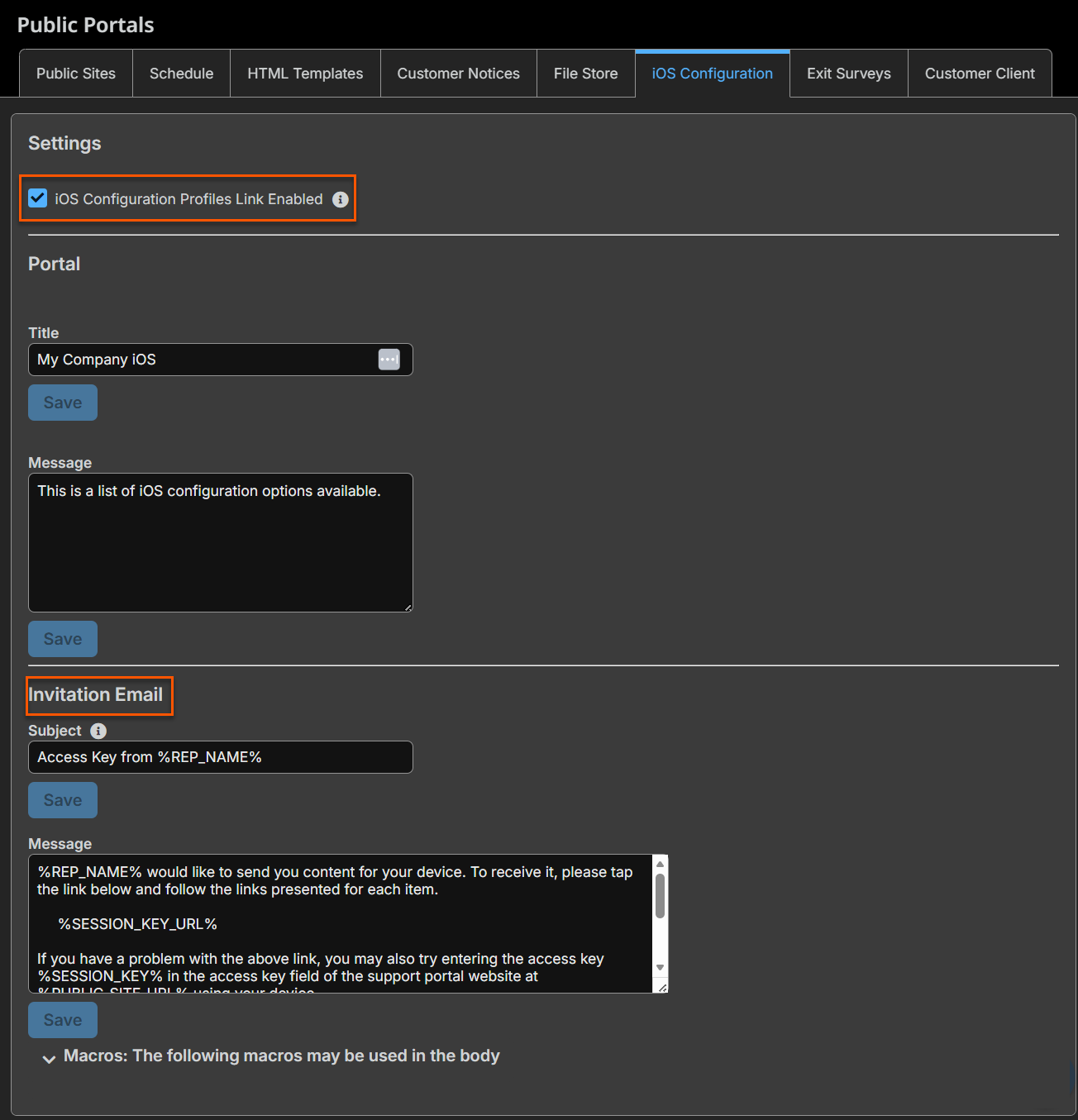 If this option is checked, customers on iOS devices will see a link to the iOS configuration profiles portal when they access the public site. This page displays any public profiles you have available, and it provides a text entry box where customers can submit an access key their representative has provided, directing the customers to a private configuration profile.
