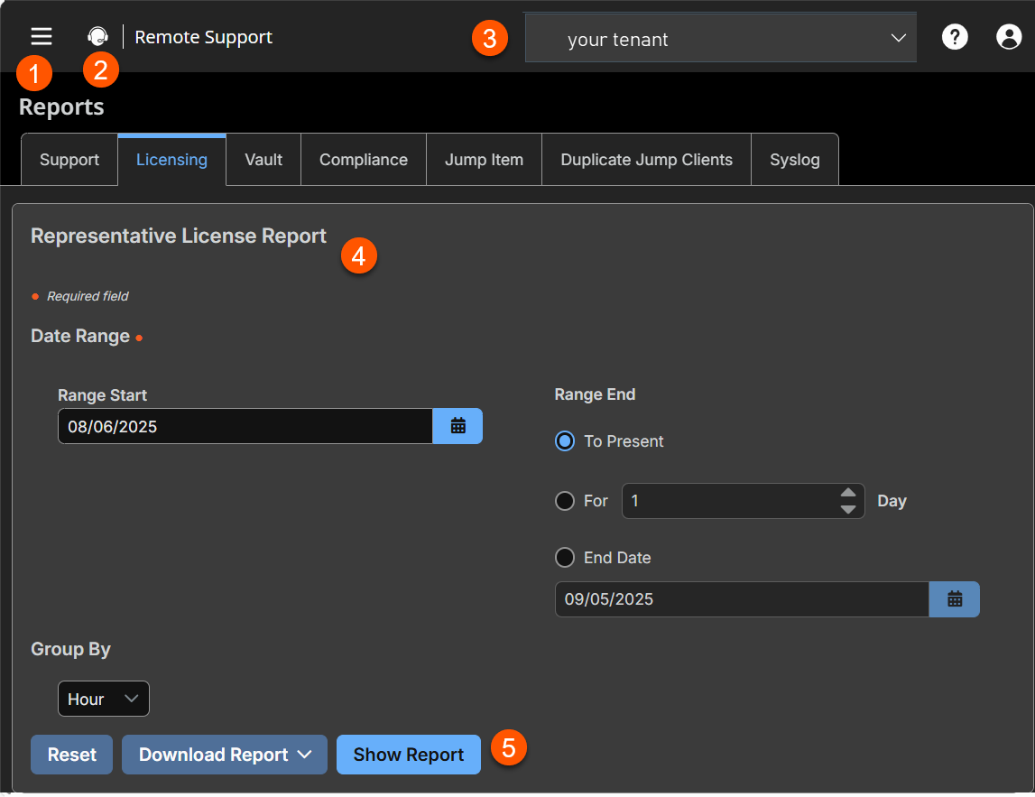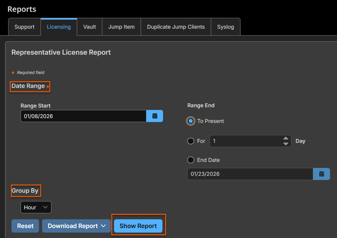 - Representative Report: Generates a licensing report by date range and group by.