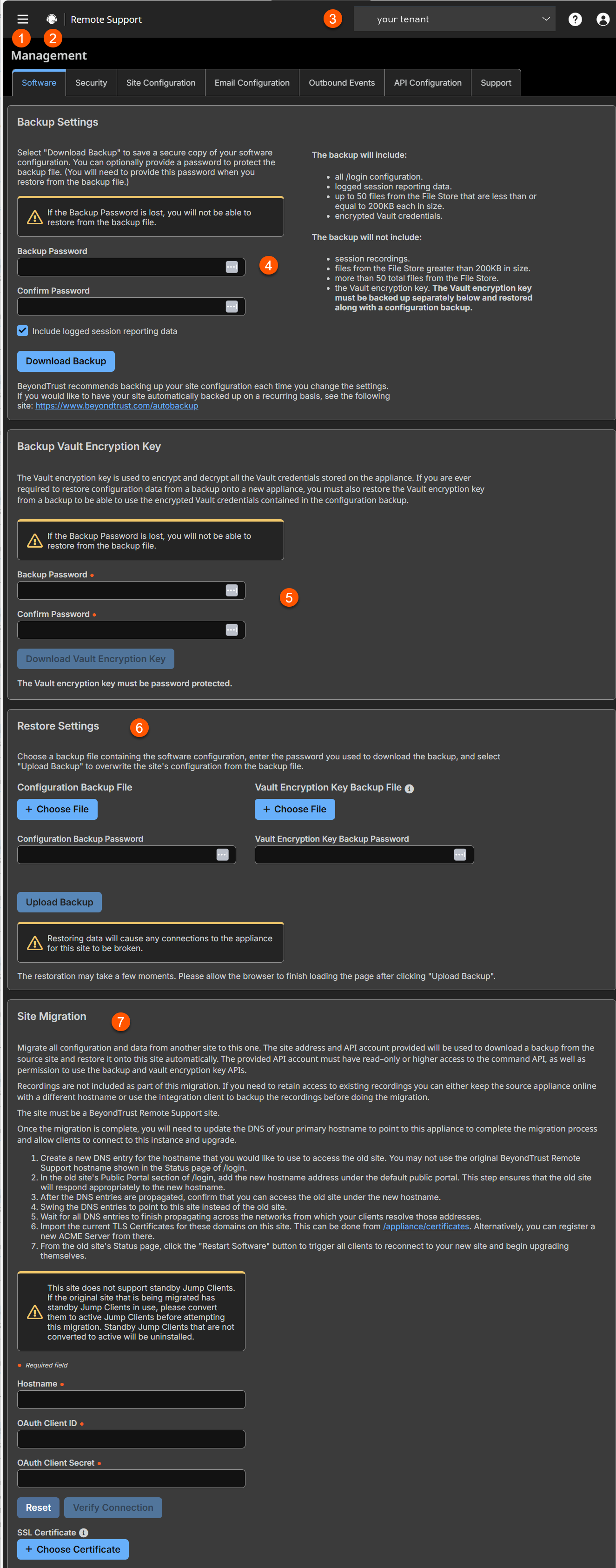 - Site Migration: Allows you to migrate configuration settings and data from another BeyondTrust Remote Support site.