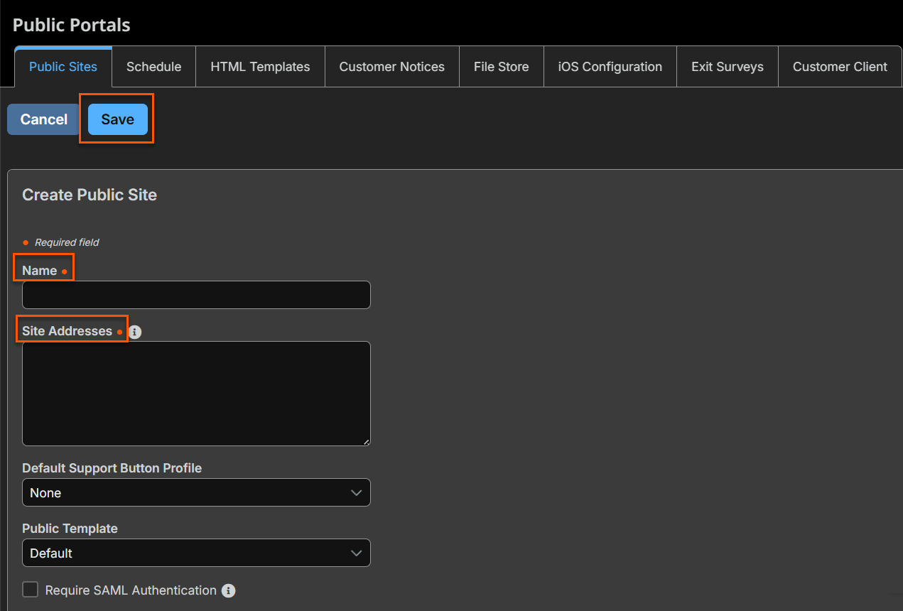 - For Require SAML Authentication, If SAML For Public Portals is configured on the Users & Security > Security Providers page, this option is available. If checked, customers must authenticate with an identity provider before a session is initiated using the public support portal.