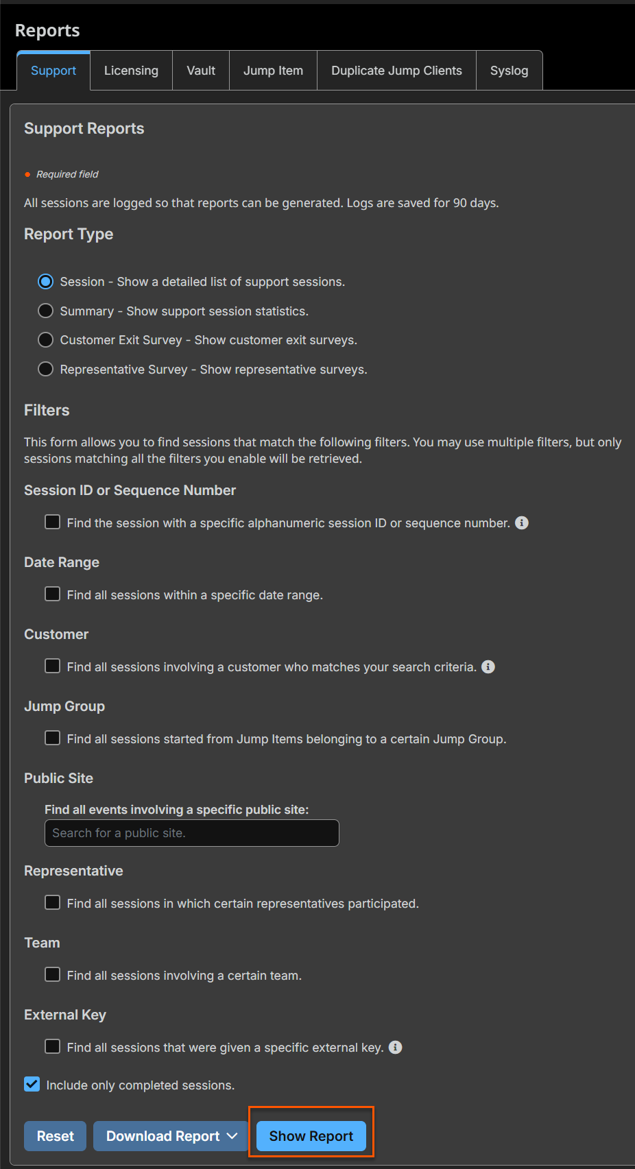 - Report Type: Select the type of report you want. The choices are Session, Summary, Customer Exit Survey, Session Forensics, or Representative Survey.