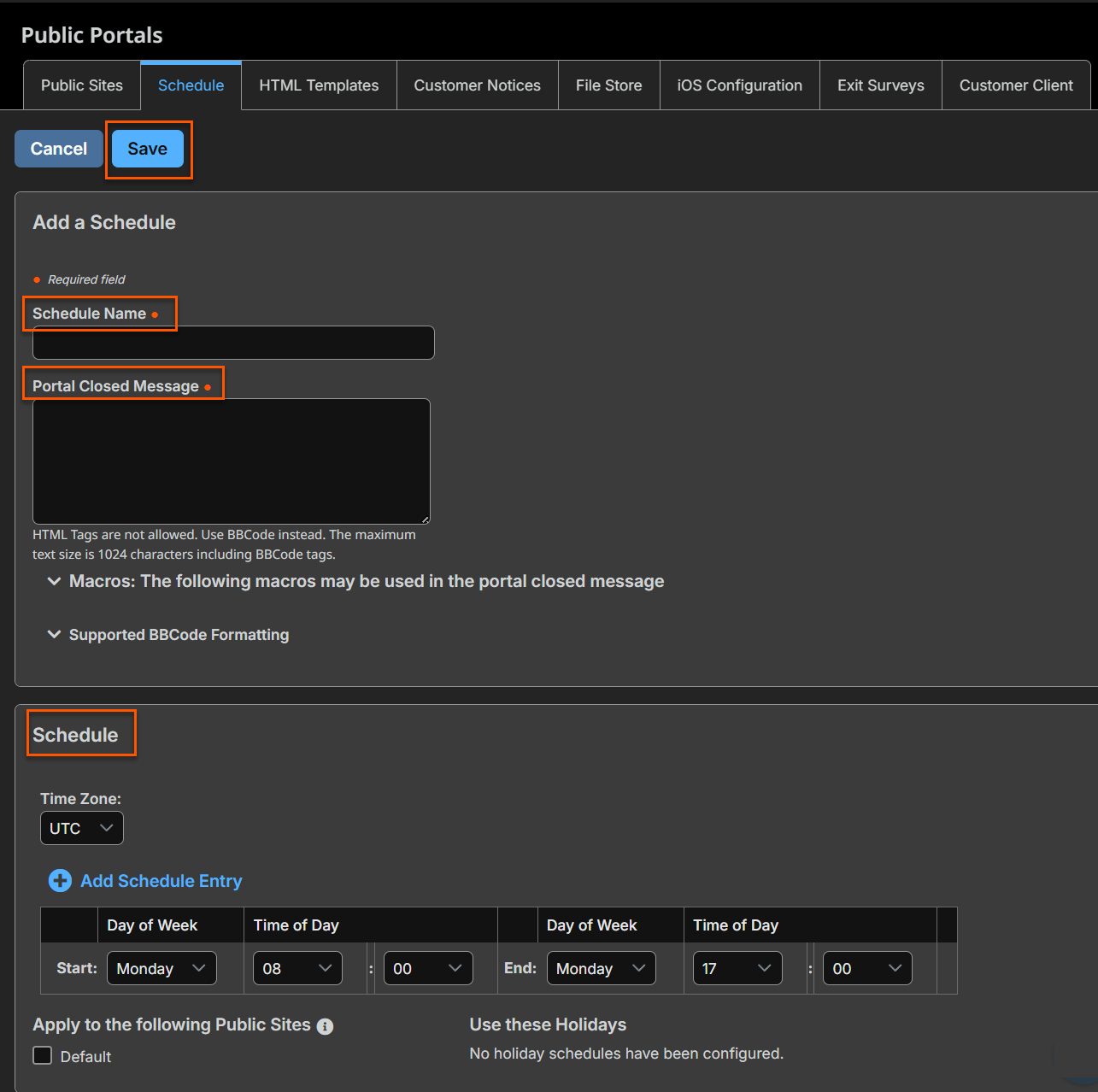 Scheduling allows administrators to control when customers can access a public portal, ensuring availability aligns with support team hours or other organizational requirements.