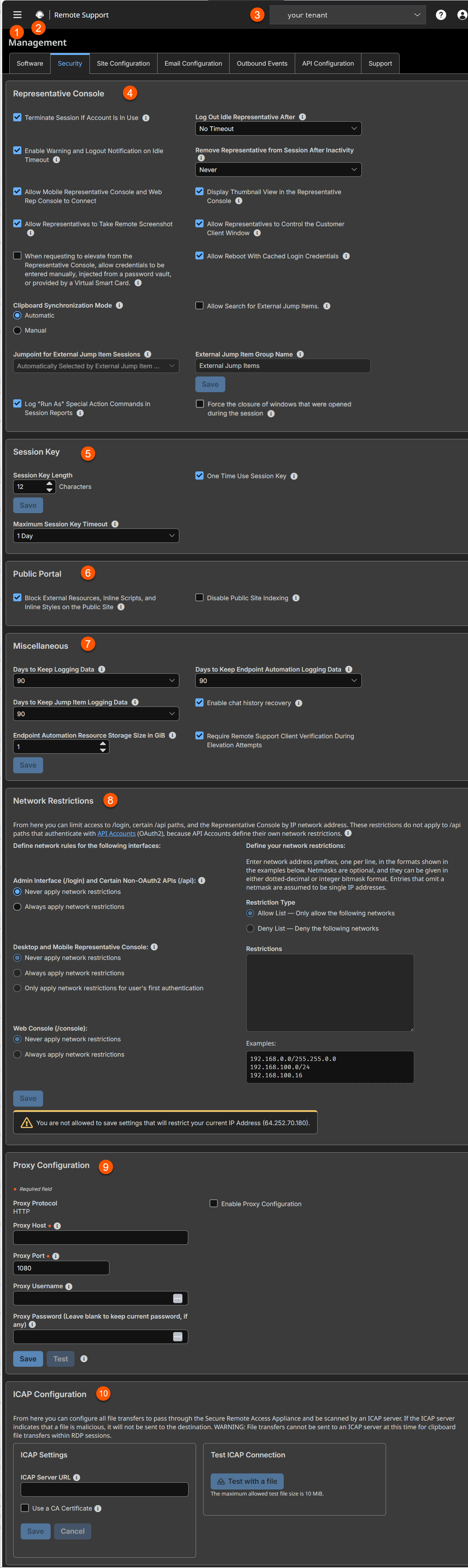 - Network Restrictions: Settings to limit access to the Admin interface, certain /api paths, and the Representative Console by IP network address.