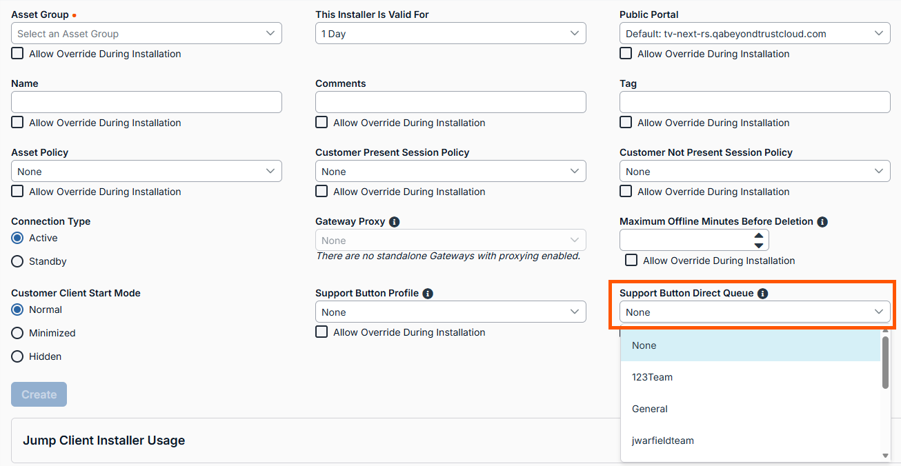 - Support Button Direct Queue: Allows the Support Button to start a session directly in the queue to which it is deployed. (The selected profile must have the Allow direct access to the queue option enabled.)