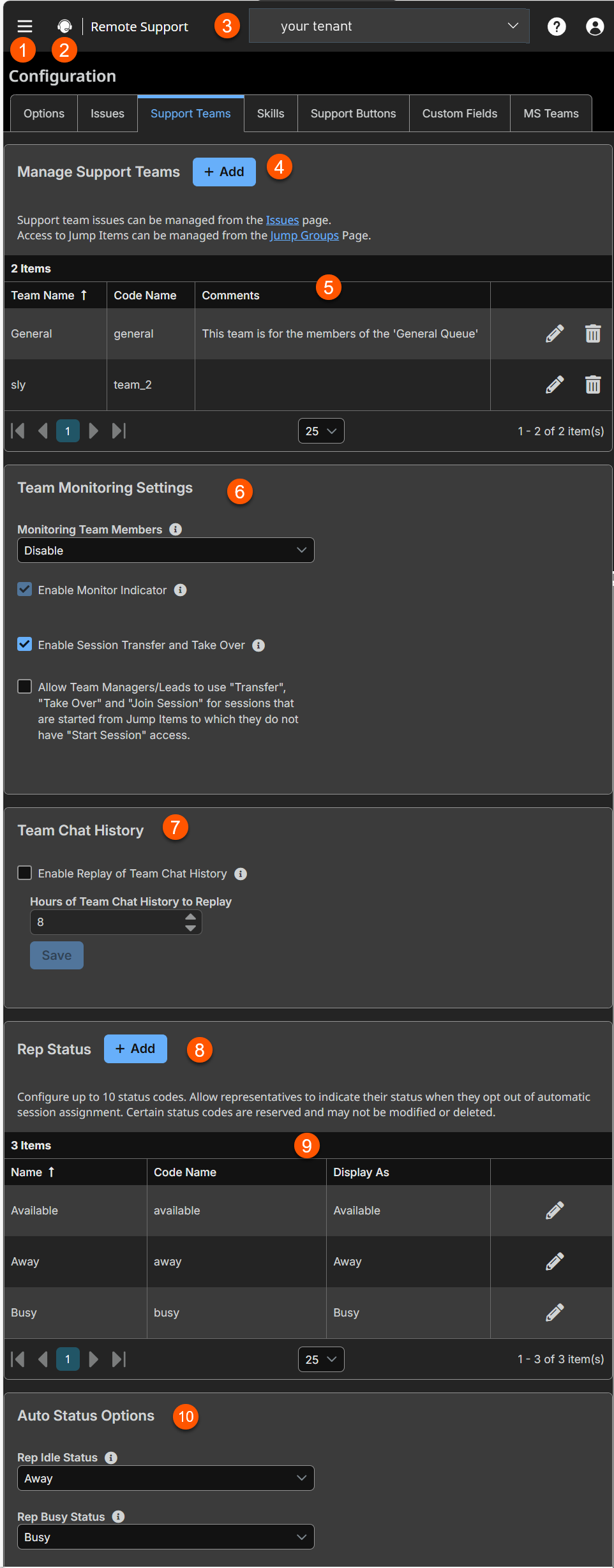 The Configuration page opens and the Options page displays by default. - At the top of the page, click Support Teams.
