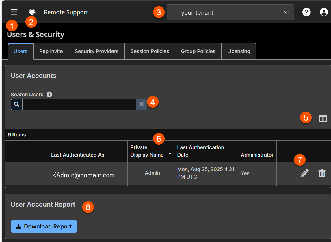 The Users page allows administrators to manage individual user accounts, including creating, editing, and deleting accounts. It provides detailed control over user-specific settings, permissions, and roles within the Remote Support environment.