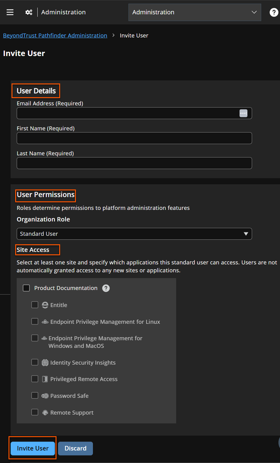 In the User Permissions section, for Organization Role, select either Standard User or Administrator.