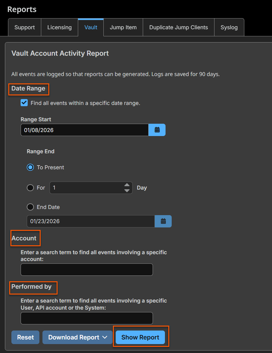 The Reports page opens and the Support tab displays by default. - At the top of the page, click Vault.