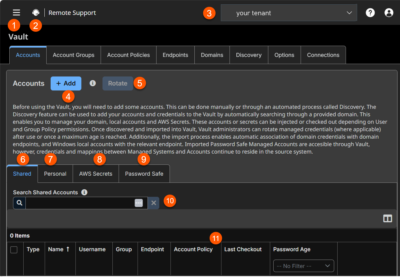 On the Vault>Accounts page, you can add a Vault account, rotate credentials, and search for accounts. There are four tabs available on this page, Shared, Personal , AWS Secrets, and Password Safe.