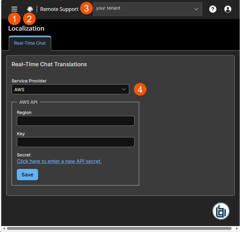 The BeyondTrust Home page displays. - From the left menu, click Remote Support > Localization.