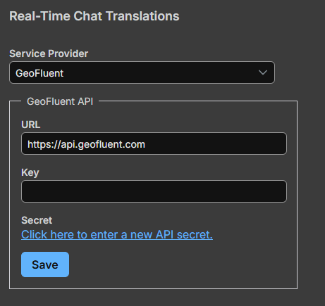 Select GeoFluent to enable real‑time translation for chat sessions using the GeoFluent service. Confirm the API URL, then enter your GeoFluent API key to connect to the service. Once saved, chat messages can be translated automatically, allowing participants to communicate in different languages during live conversations.