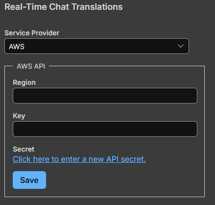 Select AWS to enable real‑time translation using Amazon Web Services. Enter your AWS region along with an access key and secret to connect to the AWS translation API. Once saved, chat messages are translated automatically during live sessions, allowing participants to communicate across languages in real time.