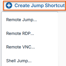 To create a Remote Microsoft RDP shortcut, click the Create button in the Jump interface. From the dropdown, select Remote RDP. RDP shortcuts appear in the Jump interface with Jump Clients and other types of Jump Item shortcuts.
