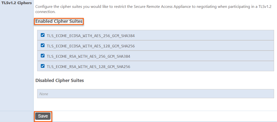 - To disable, under Enabled Cipher Suites, click the checkbox next to an enabled Cipher suites to disable it. The Cipher suite moves to the Disabled Cipher Suites.